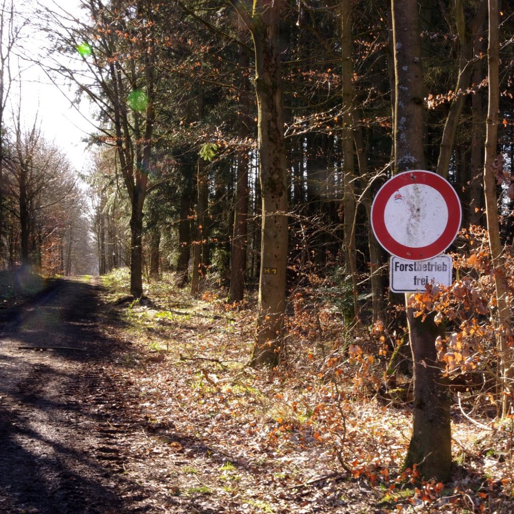 Ich entdecke, dass der Hinweis „Forstbetrieb frei“ einen anderen, früheren Hinweis überdeckt: „H1 Homberger Wanderverein“ stand da mal. Es steht da immer noch, aber es ist nicht mehr zum Lesen gedacht. Lesen soll der Wanderer jetzt „Forstbetrieb frei“. Achtung, lieber Wanderer, Du bist hier auf einer Transportstraße für Baumaufzüchter.