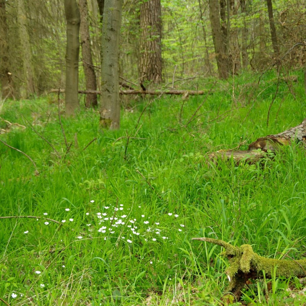 Die Sternmiere löst das Buschwindröschen als weiße Blütenfläche ab.