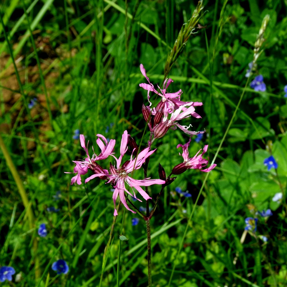 Gleich auf den ersten Schritten winkt mir auch eine ganze Schar von Kuckuckslichtnelken entgegen. Mit ihren filigranen Blütenblättern sehen die Blüten immer so aus wie zerknüllte Papierstreifen. Auch Witwenblumen sind reichlich über die Wiese verteilt.