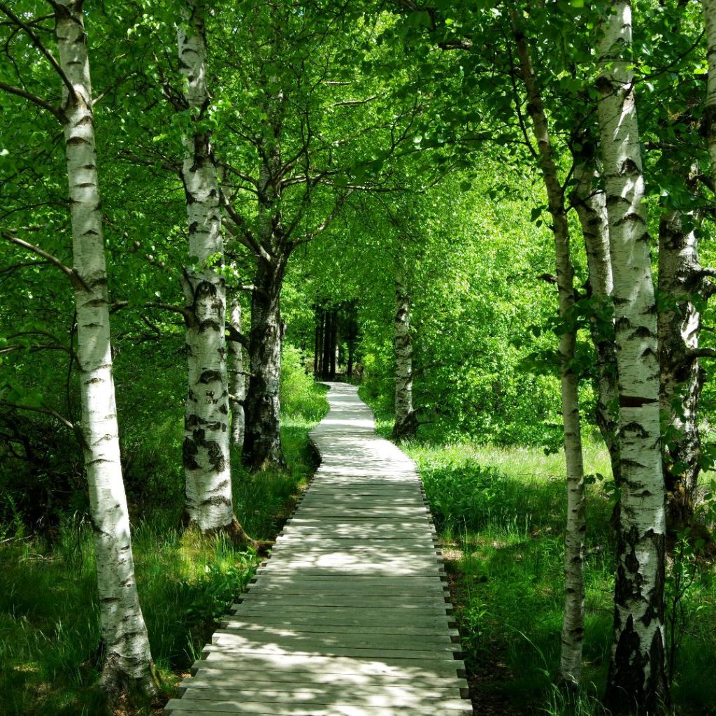 Die Holzbohlen des Weges geben meinem Schritt Verlässlichkeit. Dicke, regelmäßige Bretter, von Wind und Wetter abgeschliffen. Rechts und links neben mir ein Wald aus Birken. Der Weg mitten hindurch. Kühler, leiser als auf der Wiese. Haben Blüten und Gräser und Farben einen Klang? Wie viel stiller es zwischen den schlanken grauweißen Birken plötzlich ist. Als sei die Wiese ein Karneval aus Farben und Tönen, den ich nun hinter mir lasse.