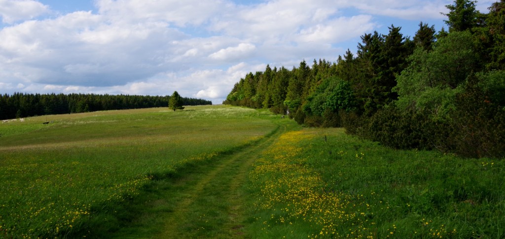 Vor zwei Wochen war ich schon einmal hier. Eine blühende Bergwiese mit Blick übers weite Land. Die Wiese voller Blüten, aber ich ohne die Muße, auf die Eindrücke zu warten. Ich hatte nicht verstanden, wie besonders dieser Ort, diese Zeit ist. Heute nun der zweite Anlauf. Schnell, schnell, damit ich Schönheit der Landschaft nicht erneut verpasse. Schnell, schnell die wenigen hundert Meter durch das Wäldchen, über die karge Wiese, bergan zur Lieblingsbank mit Aussicht.