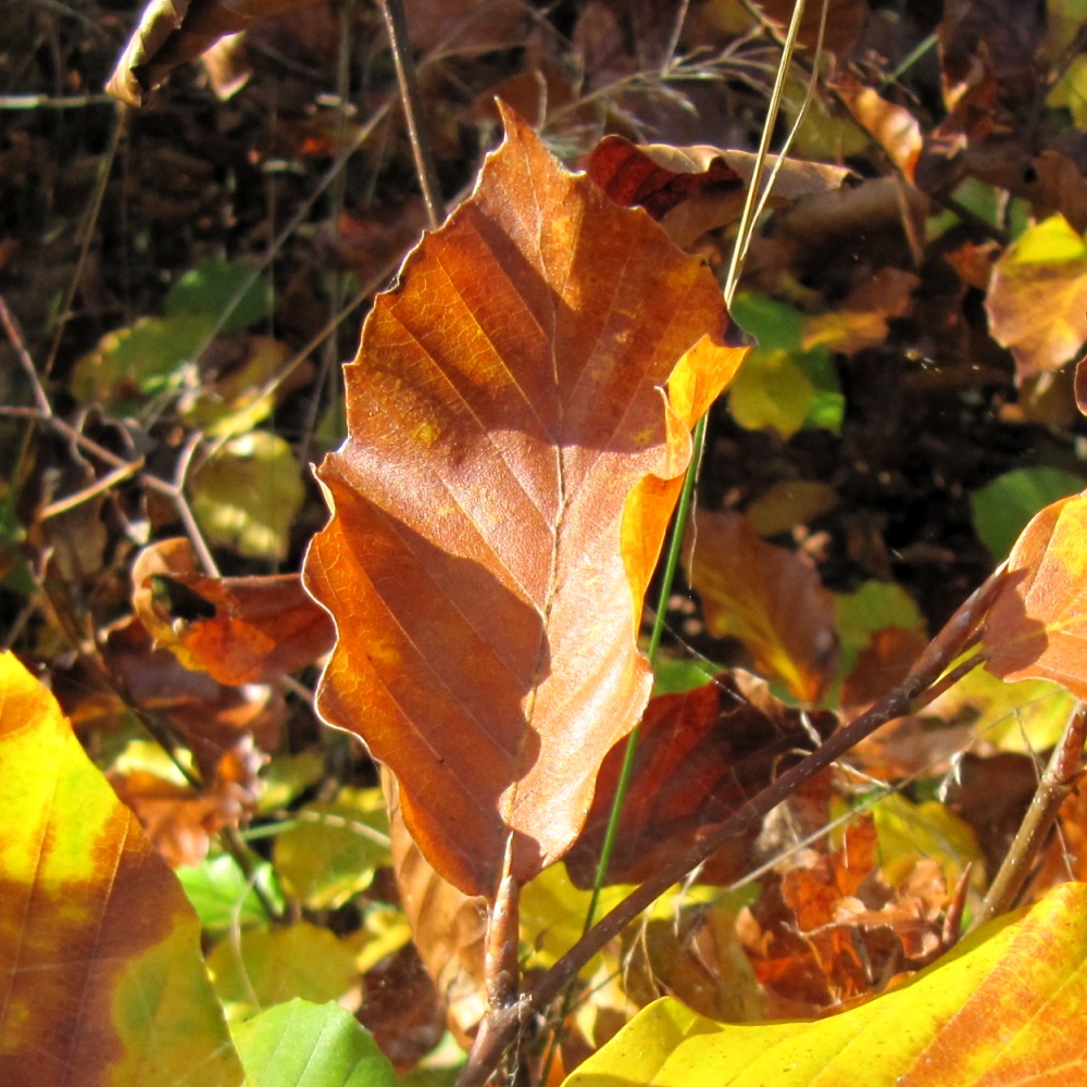 Buche bleibt lange bunt. Sie lässt sich als farbiges Blatt pressen und trocknen. Eiche behält ihre Farbe kaum einen Tag. Das bunteste Blatt am Baum. Gepflückt und nach Hause getragen ist es schon langweilig und vergilbt.