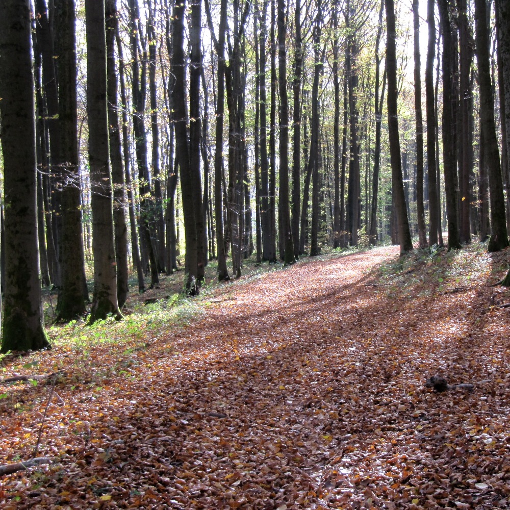 Ein breiter langer Weg durch den Wald. Schon dick mit buntem Laub bedeckt. Ich bleibe stehen und schaue dem Laub beim Fallen zu. Ich höre, wie es ganz sacht auf dem Boden ankommt.