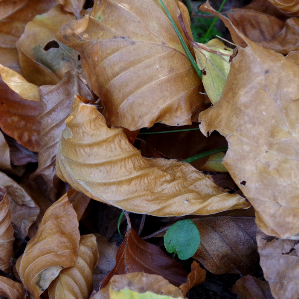 Zwischen den vielen Hunderten Herbstblättern, die braun und leblos auf dem Boden liegen, sind einige wenige, die bunt und strahlend leuchten. Noch. Ohne die vielen langweiligen Blätter wären die bunten gar nicht interessant.