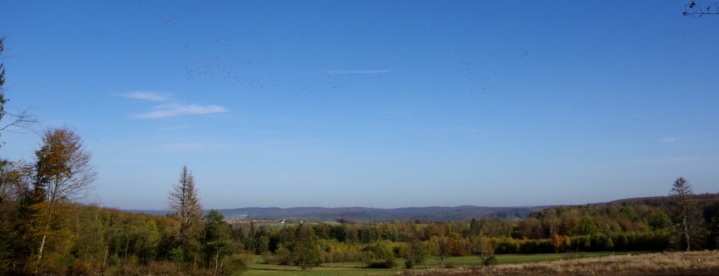 Der Tag und der blaue Himmel passen perfekt zu einem Schwarm Kraniche. In einem weitgeschwungenen Pfeil ziehen sie ihre Bahn nach Süden. Immer wieder bricht die Formation auf und es sieht aus als hätten sie die Richtung verloren. Dann verwandelt sich die Verwirrung in eine kühne Schraube nach oben. Neue Gruppen stoßen zum Schwarm hinzu. Weiter geht es mit neuem Schwung.