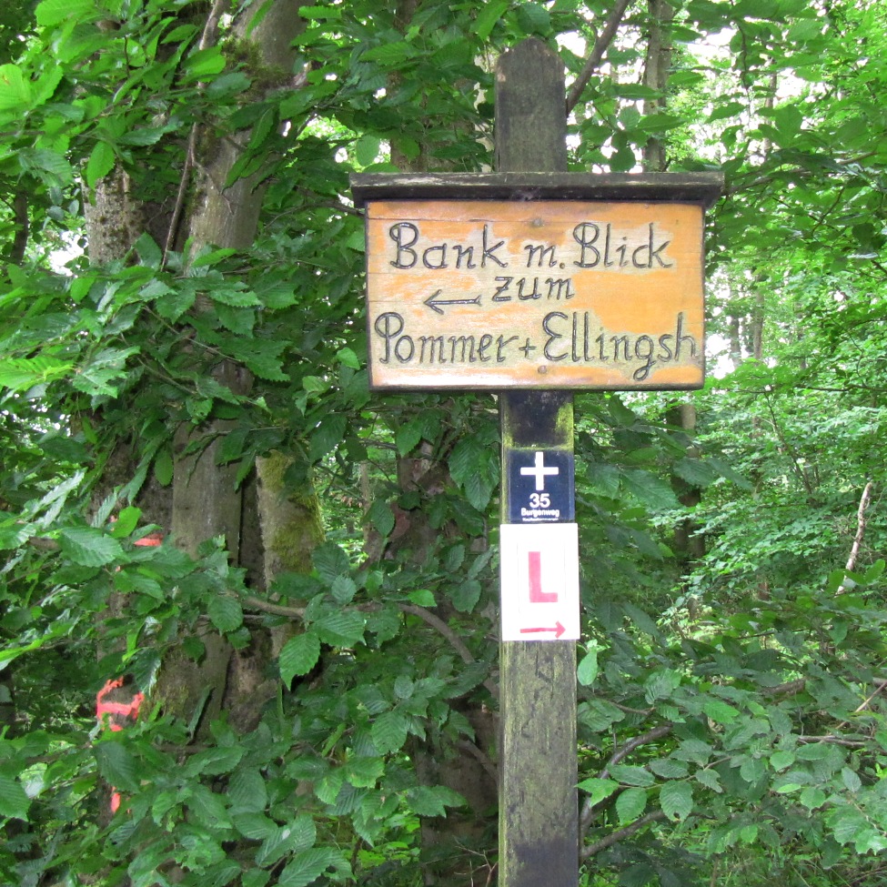 Hey toll, ein Schild weist auf eine Bank mit Blick auf den Pommer hin. Das Schild sieht fast wie selbstgemalt. Ich bin gespannt und freue mich auf die Abwechslung. Nach wenigen Schritten stehe ich neben einer moosbewachsenen Bank im beginnenden Zerfall. Vor der Bank eine Fläche von fünf mal fünf Metern. Ringsherum hohe Sträucher. Die Aussicht war einmal. Die Sträucher haben ein Versteck mit Sitzplatz daraus gemacht.