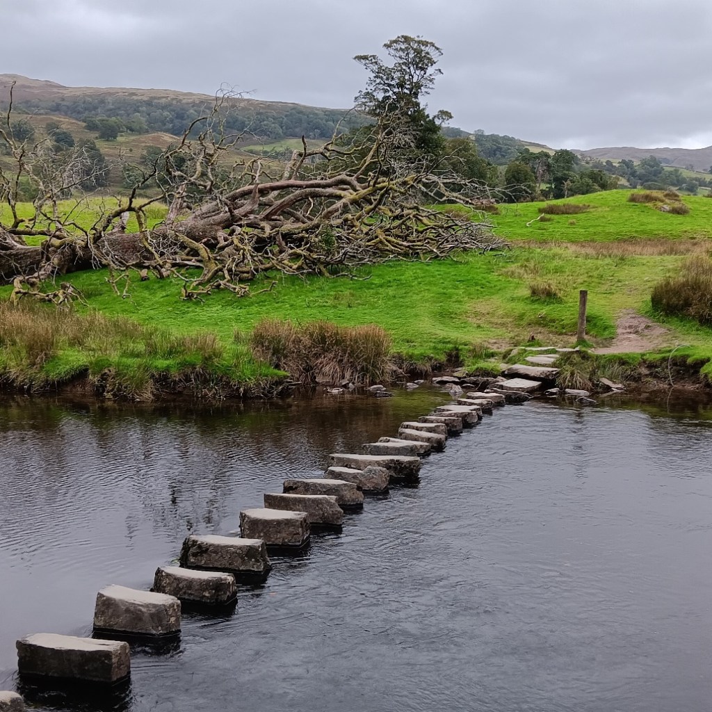 Von der Buchhändlerin bekomme ich den Tipp, für das letzte Stück zurück nach Rydal den Radweg zu nehmen. Er ist leichter zu laufen als der Wanderweg und trotzdem weit abseits der Straße. Auch dabei bekomme ich wieder Dinge zu sehen, die sonst nur am Autofenster vorbeihuschen oder mir gänzlich verschlossen bleiben. Die Trittsteine über den Fluss hätte ich sonst nie gesehen.