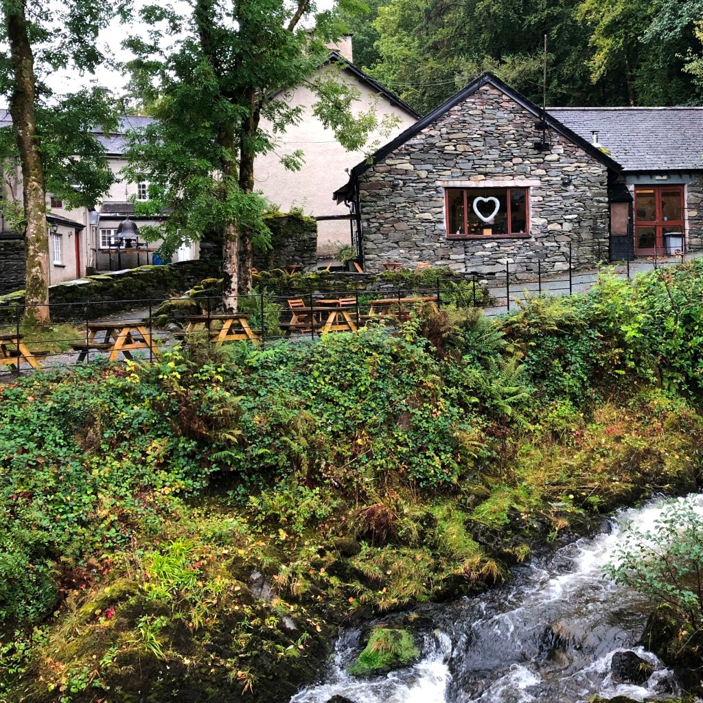 Schließlich gelingt es, doch noch das Feuer anzufachen, und ich mache mir Eier mit Speck. Danach gehe ich endlich ins Rydal-Café. Ich erinnere mich vom letzten Besuch vor Jahren noch an die Freundlichkeit und die leckeren Kuchen. In den letzten Tagen kam mir jedes Mal etwas dazwischen, das wichtiger war als eine Teepause in Rydals ehemaligem Schulhaus. Heute im Regen sieht es leider nicht mehr so einladend aus. Die Picknick-Bänke mit Blick auf den Bach und die Gartenlandschaft sind nass und abweisend. Es gibt zwar Tische im Innenbereich, aber es zieht durch die halboffene Eingangstür. Das Rydal-Café ist eindeutig ein Sonnenschein-Café. Ich laufe das kleine Stück zum Garten von Wordsworth. Im Shop des Wordsworth-Museums ist auch eine Teestube.