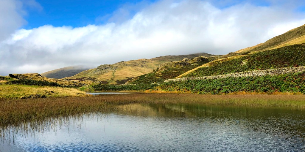 Weitere fünfzig Höhenmeter später erreiche ich Alcock Tarn – und bin sprachlos. Alcock Tarn liegt versteckt an der Bergflanke. Ich sehe ihn erst, als ich das Ufer erreiche. Der Teich ist halb mit Seerosen und Schilf bewachsen. Auf einer Seite ein kleiner Damm, durch den der Teich ins Tal abfließt. Rund um den Teich eine steinige und somehow abweisende Landschaft. Gleichzeitig atemberaubend schön. Wow! Von Alcock Tarn aus ein weiter Blick über die Landschaft: Lake Windermere, Loughrigg Fell, Grasmere. Das sind die Landmarken, die ich eindeutig benennen kann. Mindestens genauso beeindruckend sind die mir unbekannten Täler und Höhenzüge. Ich kann jeden verstehen, der sich von dieser Aussicht inspirieren lässt alle diese Orte zu erkunden. Das ist es, was auch Alfred Wainwright so fasziniert hat, als er das erste Mal diese Landschaft sah. Kein Wunder, dass Wainwrights Wanderführer bis heute so beliebt sind: Jeder, der diese Aussichten erblickt, sucht nach Beschreibungen dieser Landschaft und landet bei den Pictorial guides to the Lakeland Fells.