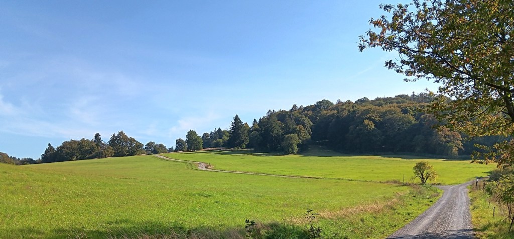 Der Hochrhöner führt nun ins Tal bis nach Kaltennordheim und dann zurück nach Mittelsdorf und von dort auf den Weidberg. Ich lasse einen Teil der Schleife aus und laufe zwar ins Tal, biege aber früher ab, um wieder bergan zum Weidberg zu kommen. Auch dies ist ein Unterschied zwischen Hessen und Thüringen. Es gibt auf dieser Seite der ehemaligen Grenze selbst heute noch weniger Wanderwege. Rund um Wasserkuppe und Milseburg kann man aus einer Vielfalt von Wegen wählen. Hier gibt es nur diese beiden Möglichkeiten. Ganz ins Tal oder nur halb ins Tal. Erst dann gibt es wieder einen Weg zum Weidberg hinauf.