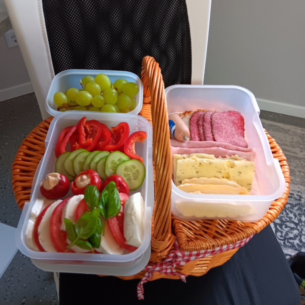 Einen Teil meiner Vorräte hatte ich bereits zuhause gezielt für diesen Abend eingepackt. Ich befürchtete, nicht rechtzeitig vor Küchenschluss hier zu sein. Es ist eine typische Eigenschaft von mir, in Fällen, die ich als Unsicherheit empfinde, einen doppelten Boden zu haben. Aber es hätte ausgereicht, den Vorrat in Tann anzulegen. Nach der Bratwurst am Nachmittag bekomme während des Schreibens tatsächlich erneut Hunger und freue mich über meine Reserven. Auch viele leckere Sachen vom Frühstück sind noch da.