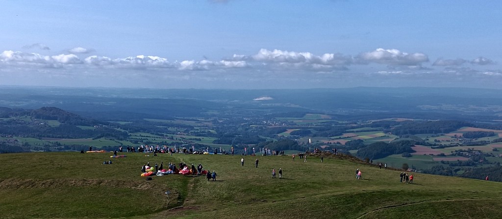 Heute ist sowohl auf dem Flugplatz als auch am Hang der Paraglider reger Betrieb. Zwischen beiden Hotspots ist dagegen überraschende Ruhe. Ich blicke weit über Land. Am Horizont suche ich den Heidelstein. Gestern war ich noch dort. Es sieht so fern aus von hier. Wie weit ich doch auch zu Fuß in der Landschaft vorankomme. Auch den Kreuzberg und andere Gipfel in Bayern sieht man von dieser Seite der Wasserkuppe aus. Ich genieße den Blick, auch wenn ich die einzelnen Gipfel nicht eindeutig benennen kann. Weite. Kraftvolle Ruhe.